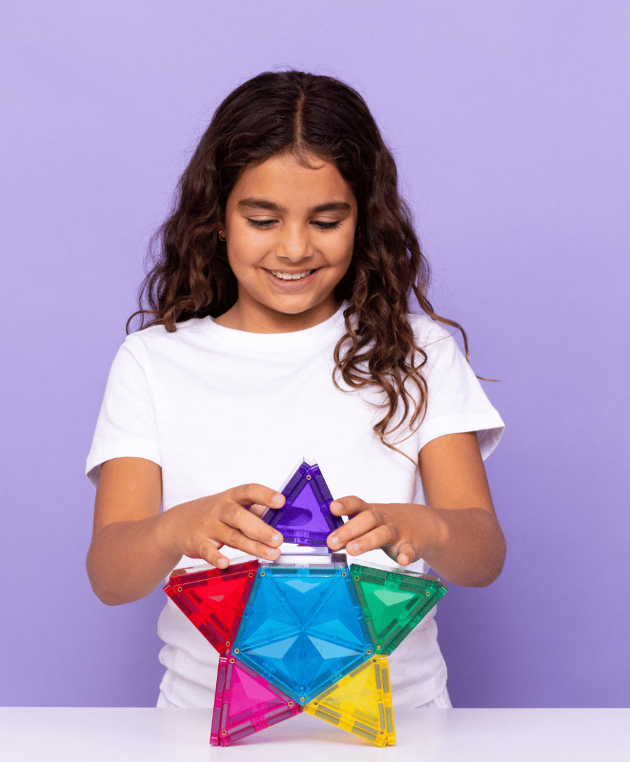 Discover the magic of open-ended STEAM play as you take colour and light exploration to a whole new level. Featuring pentagons, squares and equilateral triangles in all eight bright colours – plus a rechargeable light-up magnetic tile, this pack is designed to transform construction play into a wonder-filled lightshow!