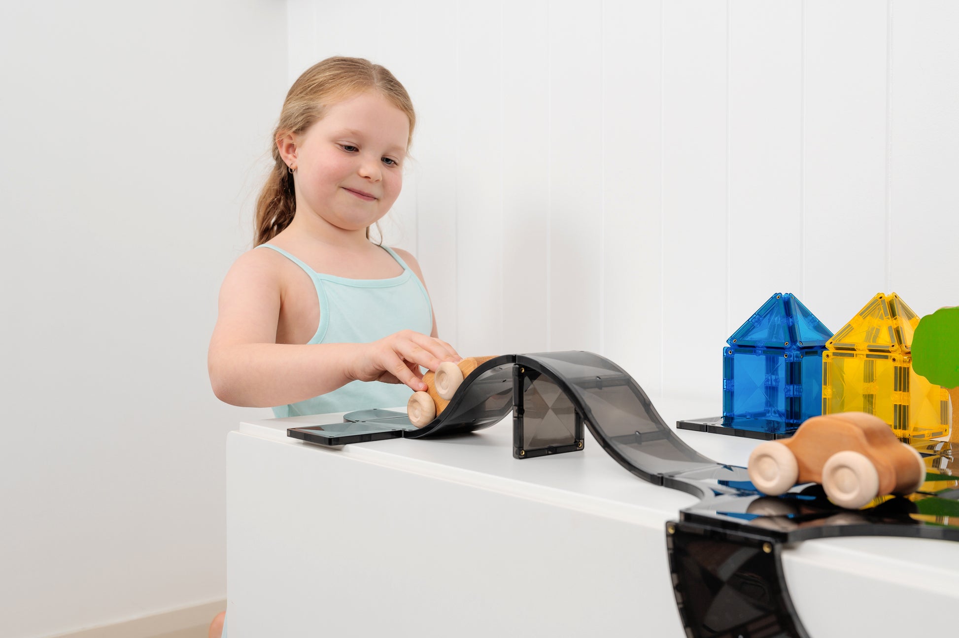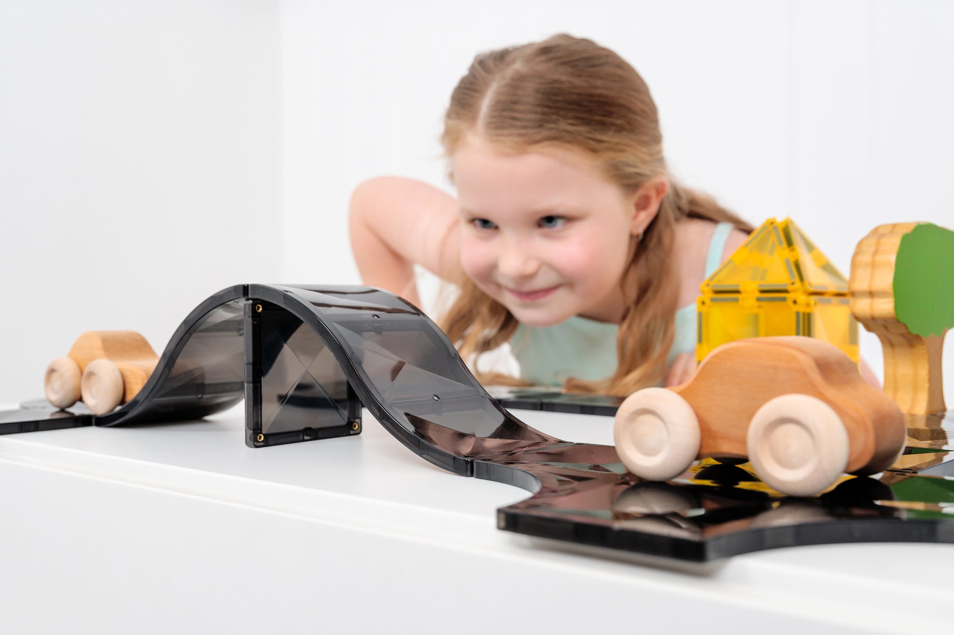 Introducing new tile shapes in sleek black, this pack inspires children to build roads, ramps and raceways while harnessing the values of open-ended play, making them perfect for exploring construction in a whole new way!
