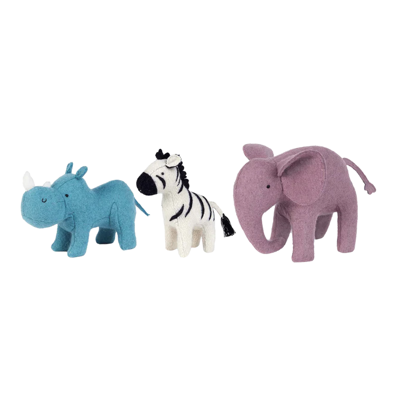 Handmade from a soft wool blend with embroidered features, these three Safari friends are the perfect size for small hands and are wonderful prompts for hours of imaginative play.