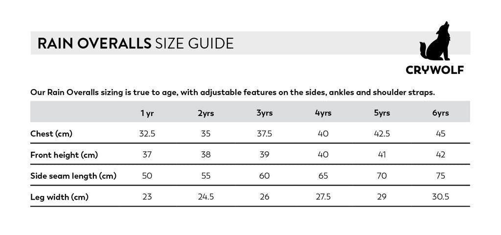Our Rain Overalls sizing is true to age, with adjustable features on the sides, ankles and shoulder straps.