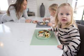 - Placemat lightly suctions to smooth surface tables and selected highchairs so no more tipped plates