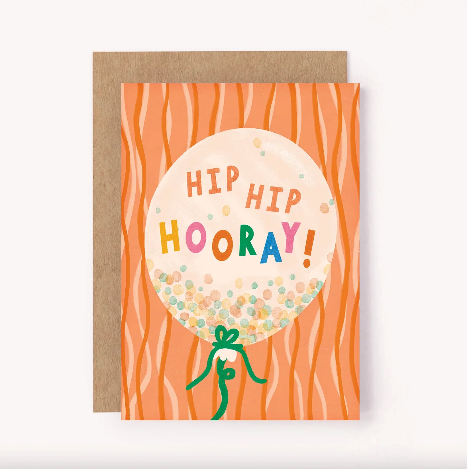 Celebrate in style with this colourful card, ideal for sending warm birthdays wishes. Featuring an illustrated confetti-filled balloon, set against a vibrant orange patterned background. The hand-lettered message “Hip Hip Hooray" adds cheer, sure to make someone smile on their special day. Blank inside for a personal message