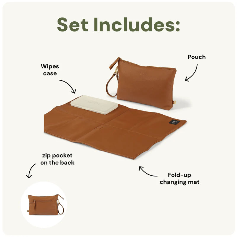 The 3 piece set includes a wipeable vegan changing mat, case for your compact wipes storage and a pouch to fit it all in PLUS nappies, spare clothes & other changing essentials.