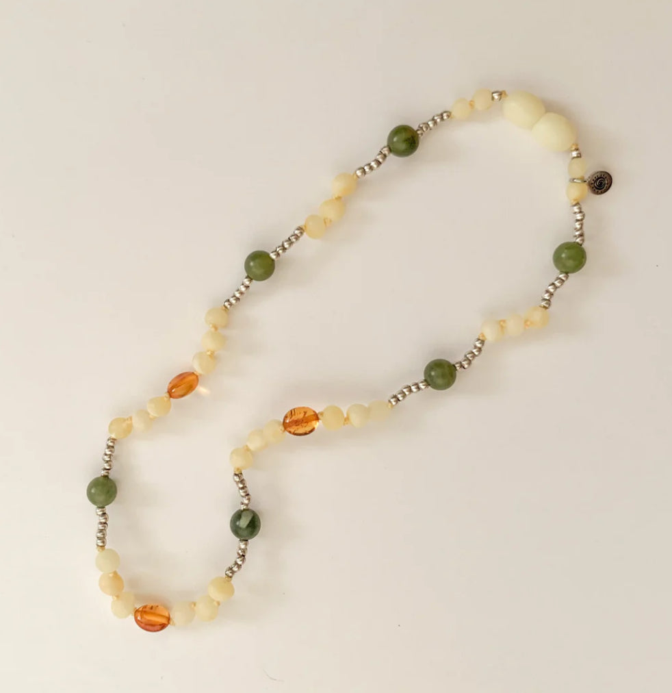 Lumi is designed with Raw Baltic amber in buttery yellow and polished cognac, Karen Hill Tribe Silver and Jasper. A deeply nurturing necklace for your little to wear