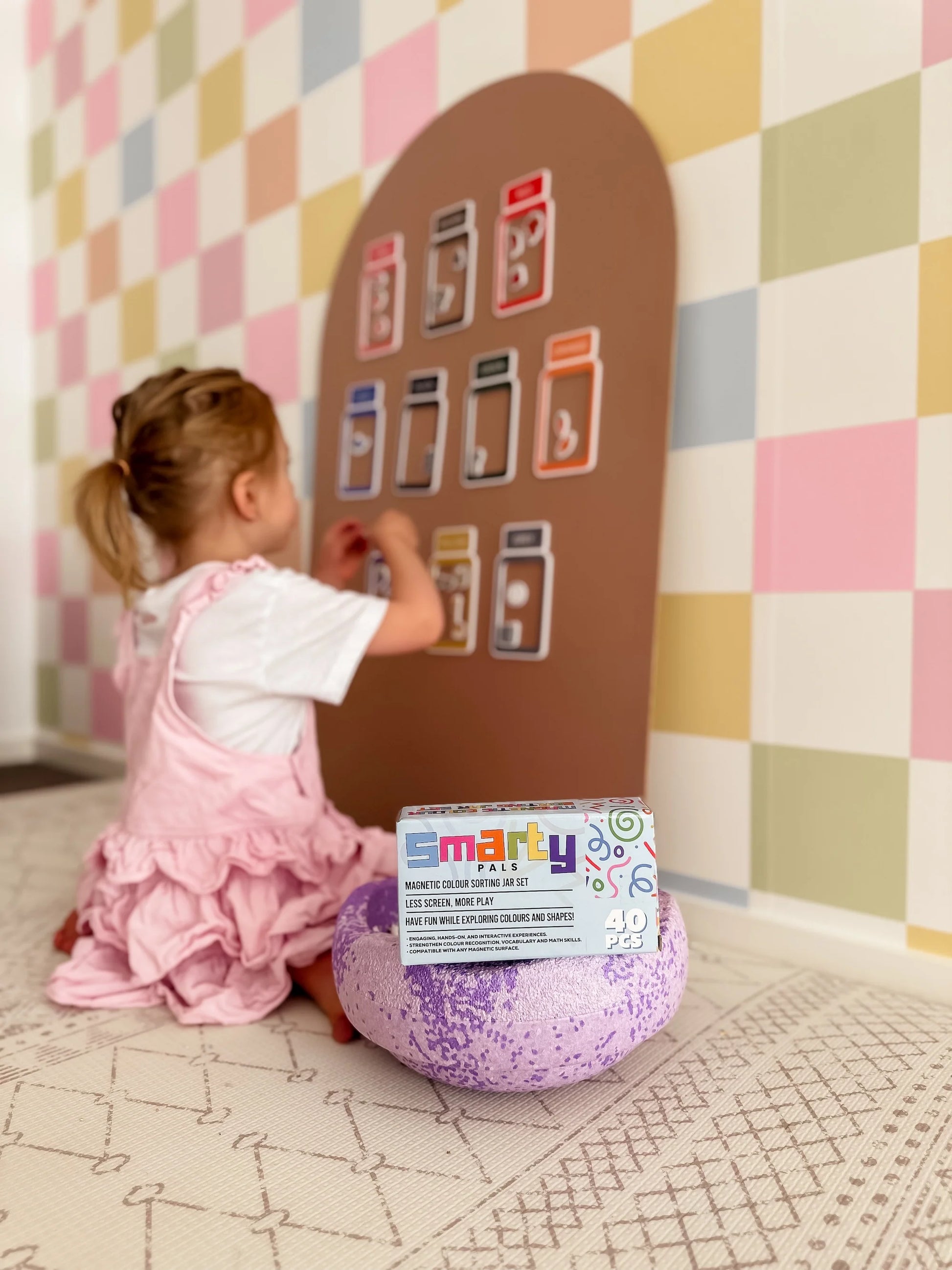 This fun and educational activity features a jar with vibrant, colourful magnetic pieces.