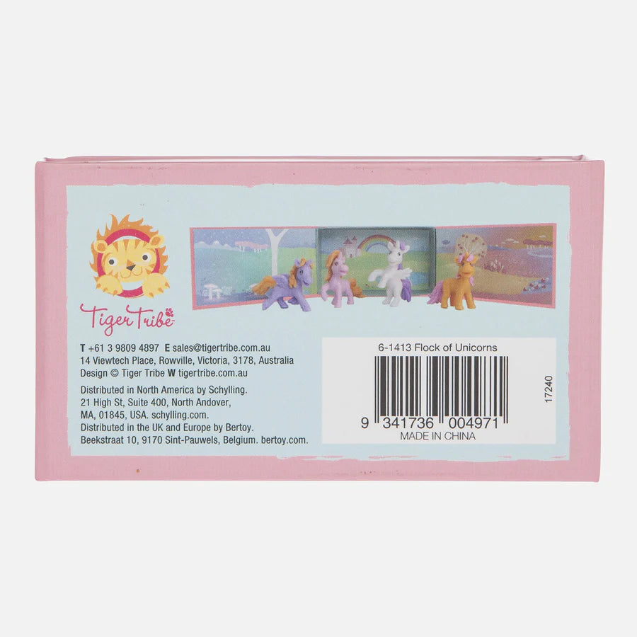 The ultimate in pocket-sized portable play - now you can take your Flock of Unicorns everywhere! Create your own on-the-go adventures with four magical mini unicorns. Each box converts into a beautifully illustrated back drop for play and display.