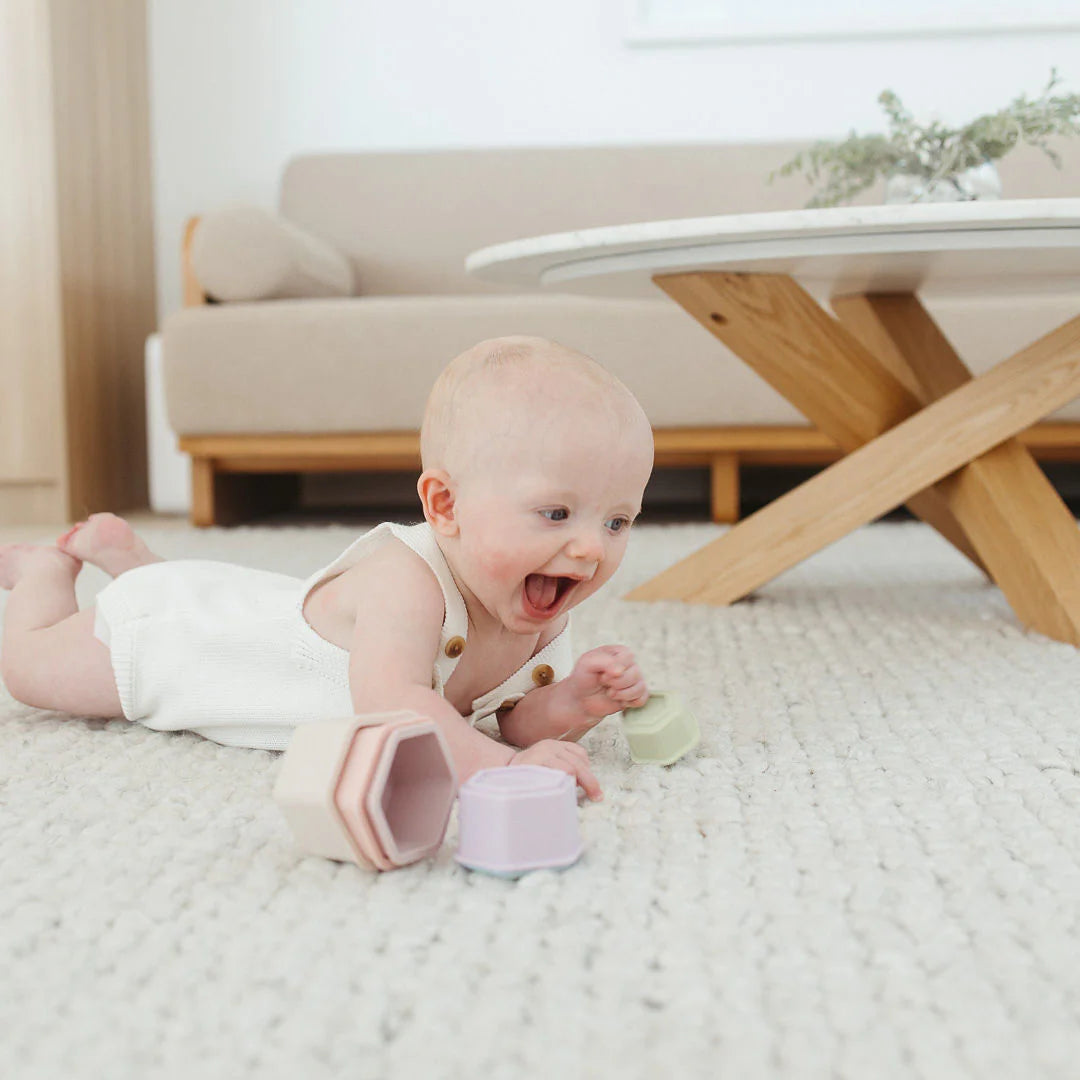 Made from soft, food-grade silicone, the cups are easy to grip, safe for mouthing, and perfect for sensory and water play. Stack them into a tower, nest them inside each other, or float them in the bath. The Stacking Hexagons invite calm, open-ended exploration at every stage.