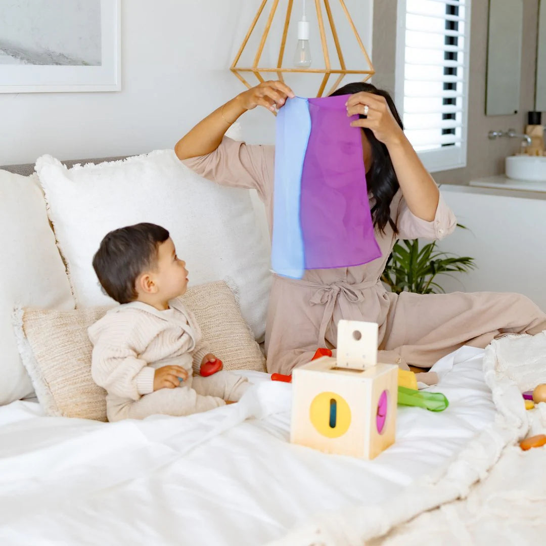 Peekaboo Play Silks: Your little one will delight in the joy of pulling out and tucking away the vibrant play silks. Designed to mimic their fascination with tissues and enhance their understanding of containment.