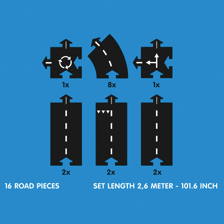 Set includes 8 curves, 6 straights, 1 intersection and 1 roundabout that are printed on both sides of the tracks. Road width 11cm.